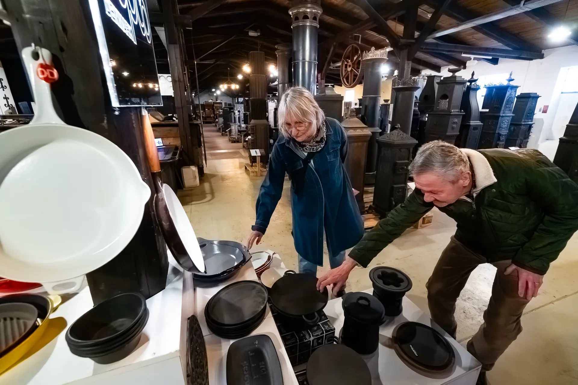 Udstillingerne breder sig over to etager og næsten 1.500 m². I underetagen følger du virksomhedens udvikling fra den spæde start i 1853 og frem til i dag – med tekst, billeder og film, der giver et levende indblik i industriens og arbejderlivets historie. På overetagen kan du se Danmarks største udstilling af kakkel- og brændeovne – en imponerende samling, der viser både håndværk, design og udvikling.
